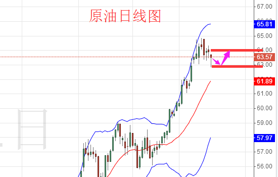 4小时上来看,布林带开口,K线运行于布林带下轨63.1附近,MA5下穿MA10形成死叉,均线整体交叉环绕运行,附图指标MACD绿色空头能量柱持续放量,DIF与DEA形成死叉良好运行,短期指标来看,原油目前处于回调整理。而上行通道也被破坏,开始走向于下行趋势,昨天晚上反弹的第四浪在64夭折,不过下方62.8也没有跌破,而是急接着反弹。