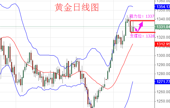 另一方面从4小时线上来看,黄金弱势下,目前处于一个关键位置布林中轨也是短期的多空分水岭,一旦跌破,那么金价将会再度回调至1325一线,反之回调结束,并确立下方支撑,继续上行。综合来看强势行情的中的回调,只要不出现连续性破低,就很容易形成双底支撑。下方重点看1325的支撑,不破偏强整理,回调幅度有限,而上方1338压力位,一旦突破行情或将继续走强。