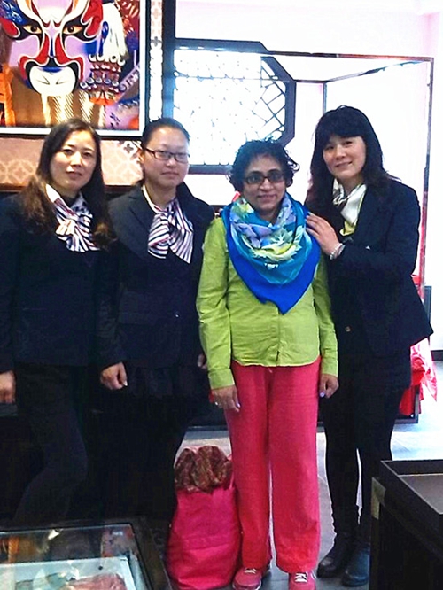 同里三月,春光明媚,太湖雪贵客盈门。3月29日下午,斯里兰卡民主社会主义共和国驻上海领事馆总领事哈山娣光临太湖雪同里店。哈山娣表示被太湖雪同里店充满中式情调而又时尚大气的装修风格所吸引,对琳琅满目的丝绸产品表现了浓厚的兴趣,并选购了一批丝巾等产品。