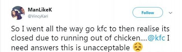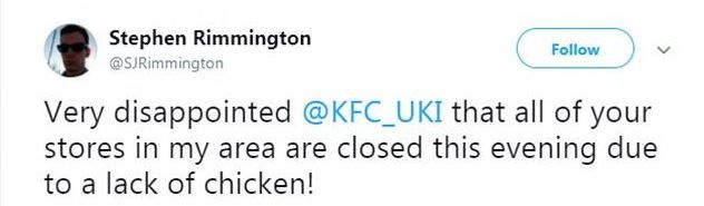 “对肯德基非常失望,今晚在我所住的地区的所有肯德基店都关了,就是因为没有鸡肉