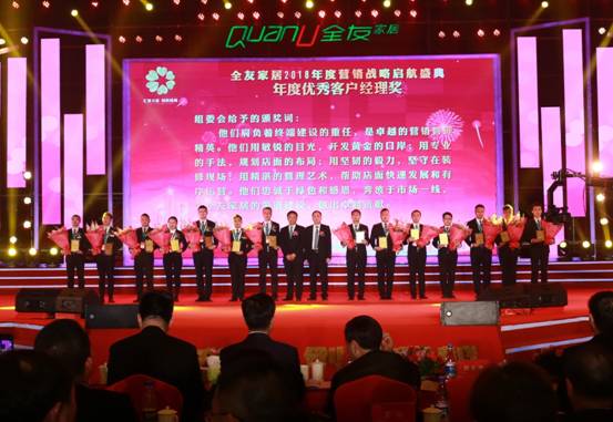 全友家居总裁办蒋总宣读了《关于表彰2017年度先进集体和优秀个人的决定》。蒋总要求,2018年,全体员工应全面贯彻“激发组织活力、提升用户价值”的经营主题,重塑责任担当,培养创新意识,推进主动作为,强化实干乐干,打造讲标准和强执行为一体的专业运营团队和专业技术队伍,为提升用户价值而不断努力,以对全友事业的高度责任感和执着精神,保持定力,务实进取,勇于创新,敢于担当,携手创造全友绿色事业新的发展高峰!