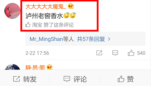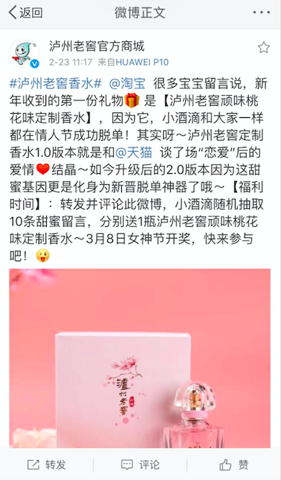 更不可思议的是,这次跨界还引发了众多剁手党蜂拥而至,在淘宝官微的“新年第一单”发问中,泸州老窖的香水瞬间登顶热门答案,话题度直线飙升。