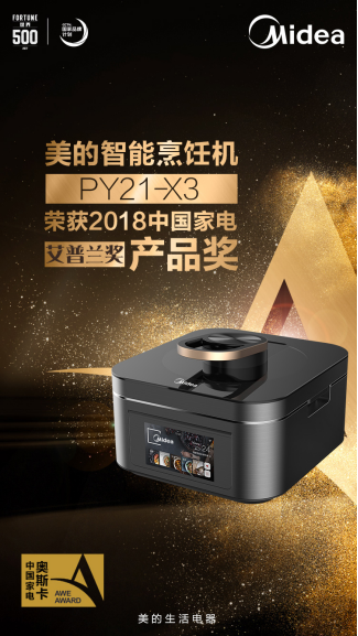 此次获奖的另一名选手,美的新一代智能烹饪机PY21-X3荣获产品大奖。X3是一款新型的、全屏触控式、能满足更多烹饪美食需求的智能烹饪机器,它依靠高规格配置、立体IH加热及智能控温技术模拟厨师火候掌控技法,实现多种烹饪模式。