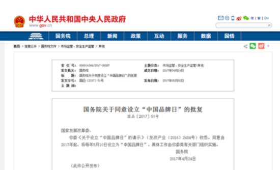\u00A0\u00A0\u00A0\u00A0国务院5月2日批复了国家发改委《关于设立“中国品牌日”的请示》,同意自2017年起,将每年5月10日设立为“中国品牌日”,今年的5月10日将会是中国历史上第一个“品牌日”。