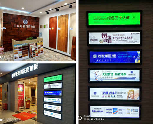 对于店面的装修,凭借着10年的经验,刘总也很有自己的想法,比如对产品卖点的设计,专门在门头设计了多个横排。“GREENGUARD绿色卫士认证”、“黄金驾到,更稳定的实木地热地板”、“无醛智造·极致环保”、“孕婴纯生,我只要E0”、“美国CARB认证”、“贝亚克·青花瓷地板,耐刮擦、抗变形、抗褪色”等几个简单的横排广告语,就把贝亚克·青花瓷地板的产品特点表现得一一俱全。