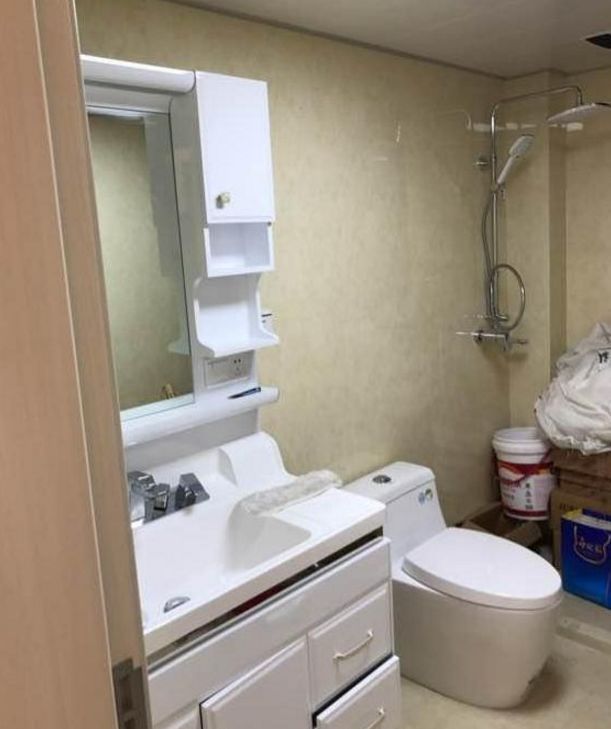 卫生间,整屋全贴着相同的瓷砖,简单大气还显明亮。不过卫生间还没全部收拾整理完看着还是有些乱的。期待之后的场景。