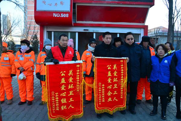 - 2016年1月28日1月27日上午,呼和浩特市环卫局书记盛宇代表呼和浩特市环卫局为呼和浩特市晨畅食品有限公司和呼和浩特市天使公益、呼和浩特市彩虹之桥志愿者协会、呼和浩特市蓝哈达爱心公益协会等公益组织送上锦旗,同时将呼和浩特市晨畅食品有限公司旗下顾大姐放心早餐命名为关爱环卫工人爱心早餐网点。呼和浩特市环卫局书记盛宇代表呼和浩特市环卫局为爱心企业和公益组织送上锦旗每天清晨环卫工人伴着第一缕阳光走上工作岗位,无论严寒酷暑从...