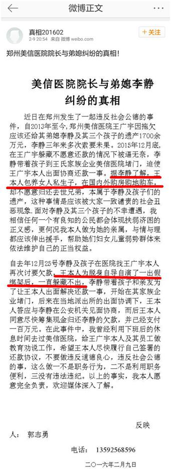 - 2016年2月10日近日郑州一医院投诉“被公务员带黑社会占领”一事在网络持续发酵,当事人在微博发声,披露美信医院院长与弟媳李静纠纷的真相,事件出现大逆转......一篇报道引发网络热议。报道称:去年12月25日至今年1月15日,郑州市司法局公务员郭志勇带领近百名壮汉,围堵医院,扯条幅、摆花圈、烧纸钱、驱赶患者、围聚打牌。起因是医院院长王广宇与其弟媳李静之间的经济纠纷。受围堵影响,医院院长被困17小时后,趁天黑破门逃出...