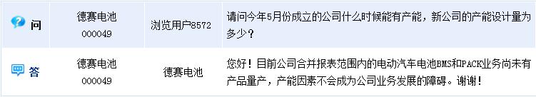 - 2016年1月4日全景网1月4日讯德赛电池(000049)上周日晚间在全景网互动平台上回答投资者提问时表示,目前公司合并报表范围内的电动汽车电池BMS和PACK业务尚未有产品量产,产能因素不会成为公司业务发展的障碍。德赛电池主营无汞碱锰电池、一次锂电池、锌空气电池、镍氢电池、锂聚合物电池、燃料电池及其他种类电池、电池材料、配件和设备的研究、开发和销售。(全景网)...
