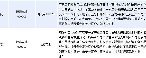 - 2016年1月20日全景网1月20日讯德赛电池(000049)周三在全景网互动平台上回答投资者提问时表示,目前公司与华为的合作对公司一季度业绩影响很小,如达到相关披露要求,公司会依法依规履行信息披露义务。公司2015年1月13日曾表示,公司与华为已建立业务合作关系、签订合作协议,并开始批量出货。德赛电池主营无汞碱锰电池、一次锂电池、锌空气电池、镍氢电池、锂聚合物电池、燃料电池及其他种类电池、电池材料、配件和设备的研究...