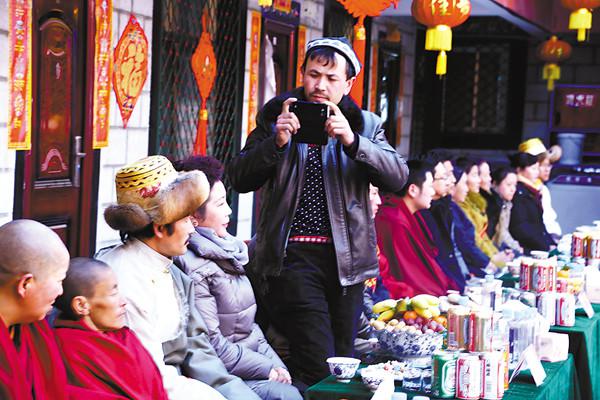 - 2016年2月11日欢乐祥和庆佳节。图为艾比布拉·米尔孜(维吾尔族)用手机记录节日的喜庆。格桑伦珠/摄2月9日,拉萨市城关区在德赛居民大院举办了“我们的节日——邻里守望与爱同行”主题活动,200多名辖区居民欢聚一堂,共庆佳节。吉祥的春联,热情的歌舞,幸福的笑脸,大家一起包的饺子,桌上摆满“卡塞”、糖果——尽显浓浓的年味!记者走进拉萨市吉崩岗街道德赛居民大院,热闹喜庆的气氛扑面而来,大家身着节日盛装一起欢度春节和藏历新...