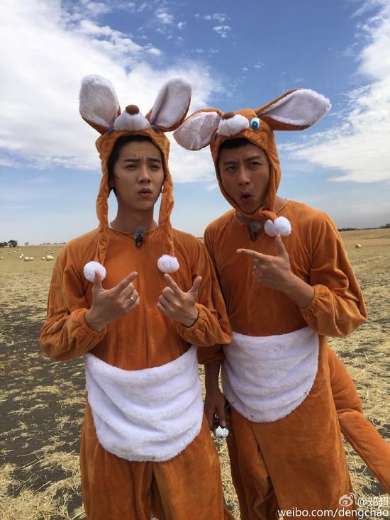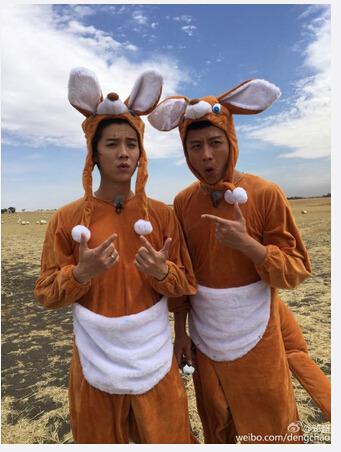 - 2016年2月12日中新网2月12日电今日,邓超在微博中晒出一张与鹿晗的合照,并称“鹿儿子,情人节快到了,爸不想看到你还单身,我想在转发评论点赞中给你选取一位儿媳妇,你说呢?”。照片两人身处草原,均穿“袋鼠装”,打扮成袋鼠模样。鹿晗眼神迷茫,双手比划剪刀手;邓超则嘟嘴,左手比划剪刀手。两人紧挨着,都显得萌萌哒。(责编:tibet)...