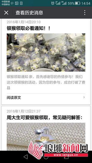- 2016年1月19日近日,有不少家住临沂费县的市民拨打市民服务热线12345称,参加微信领取礼品活动,结果到商家柜台领取礼品的时候,商家一拖再拖,不能顺利领取礼品,希望有关部门协调处理。微信公众号活动市民刘女士反映,她是在“掌上费县”微信公众号上参加了周大生珠宝的一个活动,活动是1月12日开始,推荐30个人关注“掌上费县”微信公共号便能到周大生珠宝柜台领取一个银猴吊坠。“我按照要求参加活动,很快拉够了30个人,但是1...