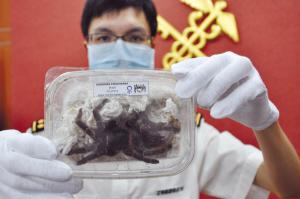 - 2014年7月23日比成人手掌还要大偷运进来作为宠物转卖7月21日上午,在杭州海关隶属温州海关驻邮局办事处的监管现场,工作人员从两个来自匈牙利的邮包中查获22只活体毒蜘蛛。毒蜘蛛装在透气的盒子里这22只毒蜘蛛,有褐色的,有金黄色的,足部完全伸展开,长度能达到20厘米左右——比成人的手掌还大,当人走近,它们会很敏捷地把前足展开作进攻状,可见有较强的攻击性。蜘蛛都被单独装在一个个透明的方形塑料小盒中,每个小盒都开有一些小...
