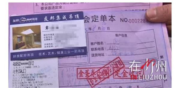- 2015年12月16日市民朱女士最近在装修房子,早在去年她就交钱定了吊顶,可是,现在找商家送货,商家却一直都没动静。朱女士说,去年年底,她在一场家装博览会上交了1000块钱定金,定购了友邦集成吊顶,后来又到友邦集成吊顶位于柳州红星美凯龙的门面交了2000块钱货款。现在,新房装修到了安装吊顶的阶段,但迟迟没有人送吊顶上门来安装。12月15日,朱女士到友邦集成吊顶门面一问,才知道“没有货了”。导购员告诉她,老板没钱,资金链...