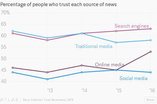- 2016年1月19日1月19日消息,据国外媒体报道,全球最大公关公司爱德曼(Edelman)连续第二年的调查显示,与新闻媒体相比,越来越多的人相信来自谷歌的新闻,而谷歌不过是对前者的新闻报道进行了聚合。爱德曼对28个国家的3.3万人进行了调查,发现在世界各地,63%的人称他们信任来自“搜索引擎”的新闻和信息,只有53%的人信任“纯在线媒体”。这一结果意味着,就同一篇新闻报道,读者更容易信任他们在谷歌新闻聚合服务上所读...