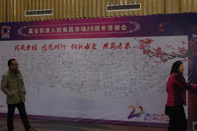 - 2016年1月29日风雨兼程?感恩同行,创新求变?共赢未来,嘉宝莉漆从1995年到2015年入驻南昌市场正好20年。2016年1月28日下午,由江西陶乐嘉实业有限公司主办嘉宝莉漆化工集团股份有限公司协办的嘉宝莉漆入驻南昌市场20周年感恩答谢会于南昌琴岛之夜大剧场隆重召开。南昌嘉宝莉员工、经销商、材料商以及媒体朋友等800多人出席了本次大会。签到板现场高朋满座本次大会以光阴故事开始,嘉宝莉漆风云变化20年仿佛历历在目,...