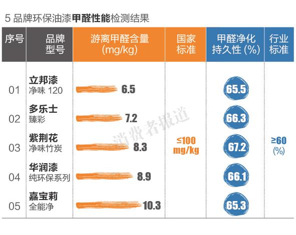- 2015年1月12日环保油漆的“净化甲醛”功能在业内持续着一场拉锯战。一方面,行业协会认为有待科学验证;另一方面,油漆厂商高举“行业标准”这柄尚方宝剑。既然谈科学,就得有数据。2014年11月,《消费者报道》向第三方权威检测机构送检了多乐士、立邦漆、华润漆、嘉宝莉、紫荆花漆5款标有“净化甲醛功能”的油漆,进行游离甲醛含量、甲醛净化效果持久性的对比测试。在游离甲醛安全性指标上,5款品牌环保油漆均大大低于国家标准≤100...