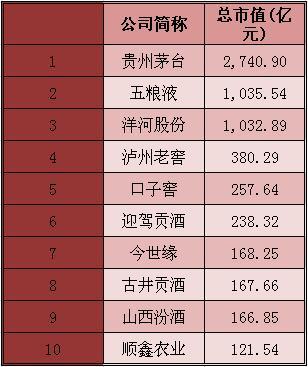 - 2016年1月11日中商情报网讯,2015年中国白酒业上市公司市值前十名排行榜出炉,前三名分别为茅台、五粮液和洋河酒位列前三。总市值的排名呈现四级,第一名茅台以超过2700亿的总市值遥遥于领先第二名五粮液,而五粮液与洋河股份的总市值相近,泸州老窖、口子窖和迎驾贡酒的总市值较为接近,第七名至第十名的总市值则更为接近。其中,排名第十的顺鑫农业的白酒业务是由“牛栏山”和“宁城”两大品牌构成。本文由中商情报网原创:...