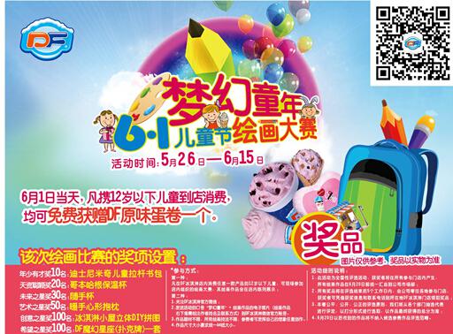 - 2015年6月29日6月,DF冰淇淋一年一度的儿童绘画大赛落下帷幕,收获了不少小朋友的作品。作为一项常规赛事,儿童绘画大赛DF冰淇淋已经连续举办了多年。每年这项比赛都在6月份举办,面向全国征集儿童绘画佳作,获奖作品将收到从DF冰淇淋总部基础的丰厚大礼,凡参与即可获奖。今年的儿童绘画大赛仍以“梦幻、快乐”为主题,以DF冰淇淋官方微信和全国终端门店为平台举办,参赛的小朋友可以在任意DF冰淇淋门店报名参加比赛、递交作品,也...
