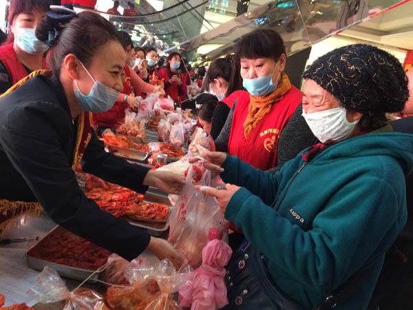 - 2015年11月9日11月7日,在抚顺红星美凯龙商场地下负一层举行的韩帝园辣白菜文化节爱心公益活动上,抚顺市慈善总会华夏义工联盟的义工和韩帝园餐饮集团的100余位志愿者一起制作了1000斤辣白菜,并将制作好的辣白菜和抚顺雪花啤酒公司捐赠的罐装啤酒送给了来自望花区、顺城区5个社区的550户低保家庭及残障人士。慈善义工与志愿者在向低保户送辣白菜。连日来,抚顺市慈善总会华夏义工联盟的义工与韩帝园餐饮集团的志愿者、抚顺雪花啤...