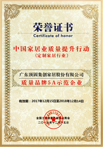 - 2018年5月9日近期,由全国工商联家具装饰业商会主办的中国家居业重塑产业链价值体系、“中国家居业质量提升行动”引领计划暨中国家居业领军企业家年会等系列活动在广东东莞现代国际展览中心隆重举行。据悉,本次盛典汇聚了家居行业各领域优秀企业,广东顶固集创家居股份有限公司应邀出席了本次盛典。在盛典中,顶固全屋定制凭借环保的材质、卓越品质荣膺中国家居业质量提升行动全国家居业“质量品牌5A级示范企业”殊荣。在激烈的市场经济下,...