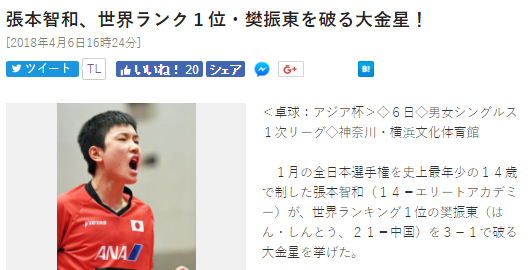 - 2018年4月8日网易体育4月6日报道:北京时间4月6日,2018年第31届乒乓球亚洲杯在日本横滨开赛。比赛刚刚开始国乒就接连爆出大冷门,日本14岁的华裔小将张本智和在男单小组赛第二轮比赛中,3-1战胜现世界第一樊振东,这场家门口的胜利让日本媒体激动不已,引起了网友热议。在5日的抽签仪式上,张本智和面对“死亡A组”时曾坦言,即使困难也毫不惧怕:“每场比赛都会是苦战,但是即便如此,还是想要打败他们夺得冠军。”今日本土...