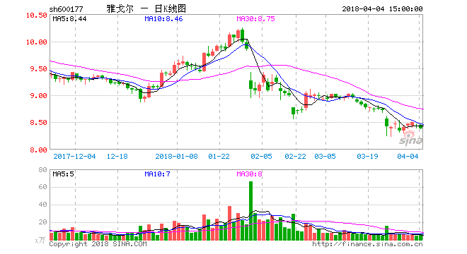 - 2018年4月7日(以下内容为智媒体实验室AI机器人小南自动生成)2018年03月23日早盘09时30分,雅戈尔(600177)股价进一步下挫,下跌-1.72%。截至发稿,该股报8.57元/股,成交量2324手,换手率0.006%,振幅0%。雅戈尔发布的最新2017年第三季度财报显示,公司净利润26.78亿元,同比下降19%。雅戈尔所在的服饰行业,其相关个股跨境通,步森股份,拉夏贝尔跌幅较大,分别下跌-6.829%...