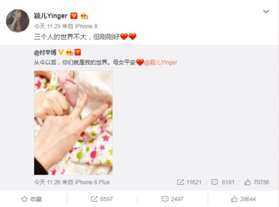 - 2018年3月1日25日上午,付辛博在其本人微博晒出了自己与颖儿的手和小公主的小脚丫的合照宣布自己晋升为“奶爸”:“从今以后,你们就是我的世界,母女平安”;随后颖儿转发这条微博:“三个人的世界不大,但刚刚好”。一家三口恩爱幸福,令人羡慕。2017年8月24日,付辛博与颖儿公开恋情,12月12日公布怀孕。【1】【2】【3】【4】(责编:常力元、慎志远)...