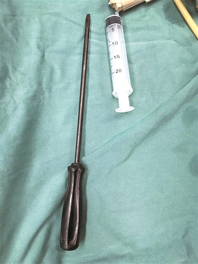 - 2018年2月24日从小孩口中取出的50多厘米长的螺丝刀广州日报讯\u00A0(全媒体记者周洁莹\u00A0通讯员张灿城摄影报道)前日下午3时多,一名两岁左右的小男孩手持一把50多厘米长的螺丝刀玩耍,不慎摔了一跤,导致螺丝刀从口腔插入上颚,深约6厘米,直达颅底,险些伤及视神经。幸而经过暨南大学附属第一医院口腔科紧急手术施救,没有危及生命。目前孩子体征平稳,仍在医院接受抗感染治疗并等待进一步评估视神经是否受损。时下正值...