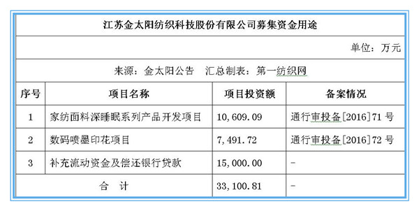 - 2018年1月5日江苏金太阳纺织科技股份有限公司(以下简称“金太阳”)昨日晚间在证监会网站披露招股说明书,公司拟在深交所创业板公开发行不超过3100万股,计划募集资金3.31亿元,其中1.5亿元用来补充流动资金及偿还银行贷款,1.06亿元投向家纺面料深睡眠系列产品开发项目,其余将投向数码喷墨印花项目。公开资料显示,金太阳的主营业务是家纺面料的研发、设计和销售以及部分家纺成品的加工和销售。2017年前三季度,公司实现...