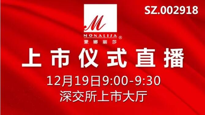 - 2017年12月25日\u00A0\u00A02017年12月19日,经中国证监会批准,蒙娜丽莎集团在深圳证券交易所正式挂牌上市。这意味着资本市场再添一建陶行业重量级大佬,也意味着蒙娜丽莎在资本的助力下迈进辉煌新征程!\u00A0\u00A012月19日上午,蒙娜丽莎集团股份有限公司在深圳证券交易所挂牌上市,上市代码:002918,发行价格为31.29元/股,发行规模为3,943万股,开盘以后便一路飙红涨停!传统制造标...