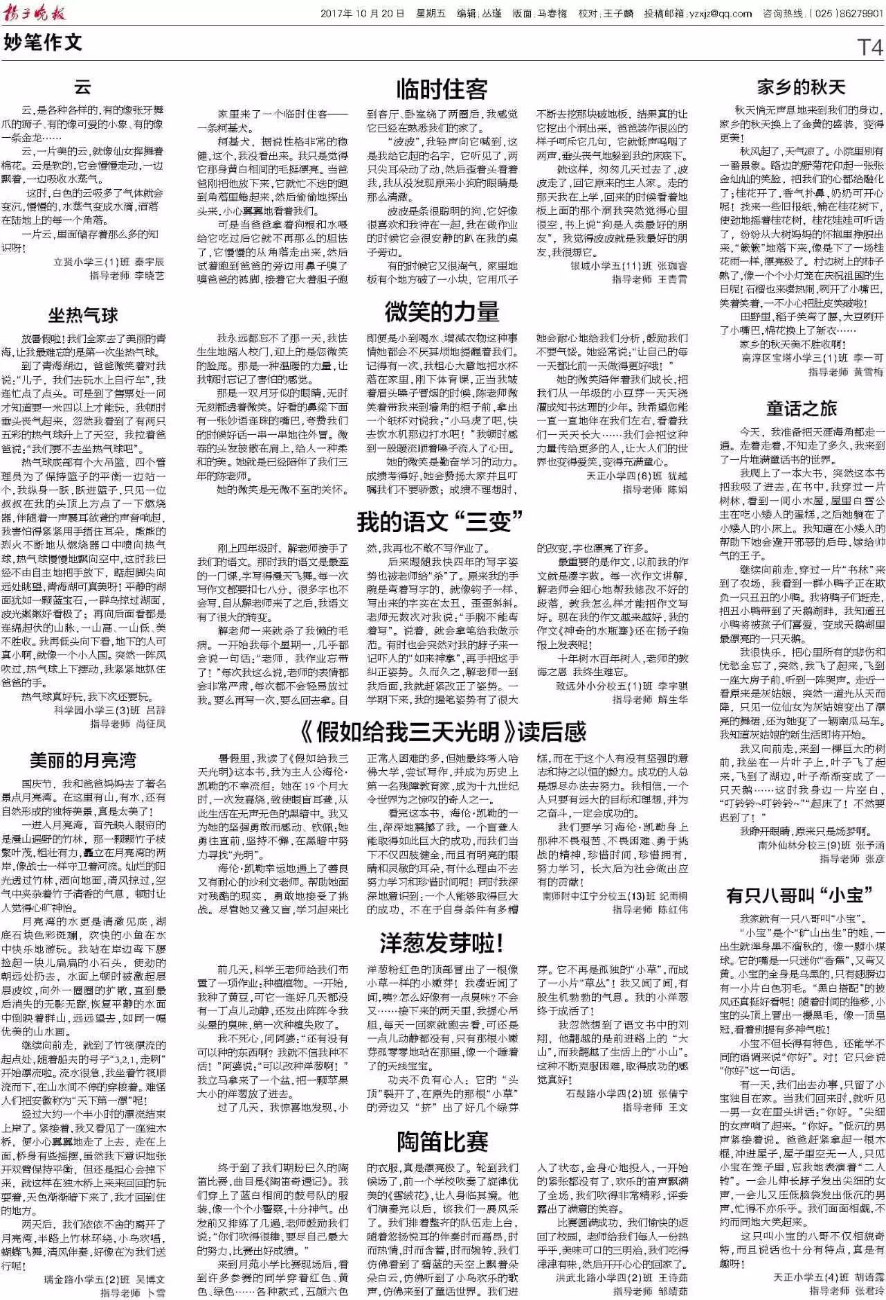 - 2017年12月11日原标题:【扬子晚报小记者】(171020T4)自由投稿一之我手写我文,快为他们的文采投上一票吧!第139期扬子小记者妙笔作文周评选立贤小学三(1)班秦宇辰云,是各种各样的,有的像张牙舞爪的狮子、有的像可爱的小象、有的像一条金龙……云,一片美的云,就像仙女挥舞着棉花。云是软的,它会慢慢走动,一边飘着,一边吸收水蒸气。这时,白色的云吸多了气体就会变沉,慢慢的,水蒸气变成水滴,洒落在陆地上的每一个角落。...