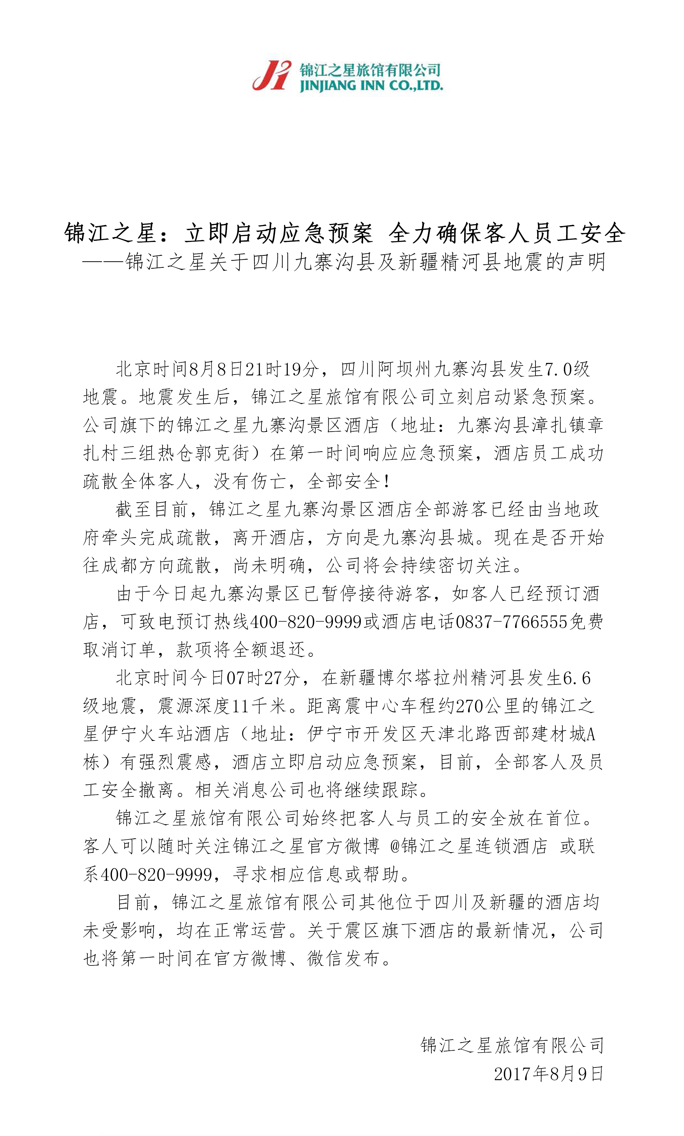 - 2017年12月8日原标题:锦江之星关于四川九寨沟县及新疆精河县地震的声明返回搜狐,查看更多责任编辑:声明:本文由入驻搜狐号的作者撰写,除搜狐官方账号外,观点仅代表作者本人,不代表搜狐立场。...