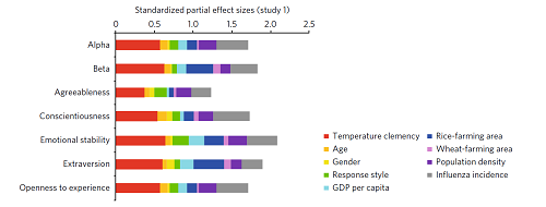 - 2017年12月2日俗话说“一方水土养一方人”。其中“一方”,指的是某一地域;“水土”,包括地理位置、物候环境;“一方人”,则是长期生活在这一地域的人。不同地域上的人,由于环境的不同、生存方式不同、地理气候不同,心理和行为特征也不同。这也就是所谓的“地缘性格”。地缘人格差异普遍存在,但究竟是什么原因造就了地缘人格差异?这个问题一直悬而未解。更重要的是,在探讨造就地缘人格差异的众多可能因素中,相比人文环境作用的理论和研...