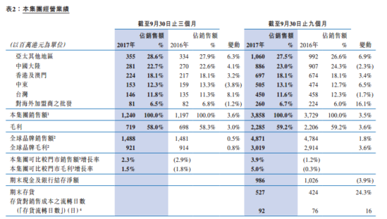 - 2017年11月28日佐丹奴国际有限公司发布了其集团截至2017年9月30日止三个月之未经审核业务最新资料的公告。据公告显示,佐丹奴国际第三季度的集团销售额增长3.6%至12.40亿港元。相比同期2016年的销售额11.97亿港元略微增长。其中中国大陆三季度的销售额国2.81亿港元,占总销售额的22.7%。在销售额增长的带动下,集团的毛利增加3.0%,惟部分因毛利率下跌0.3个百分点而抵销,乃因为渠道组合转变及进行针对...
