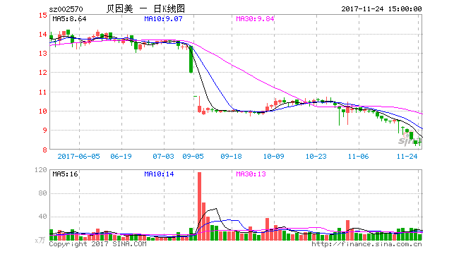 - 2017年11月27日2017年11月17日临近收盘14时42分,贝因美(002570)出现异动,股价大幅下跌6.2%,创历史新低(除权后价格)。截至发稿,该股报8.92元/股,成交量13.368万手,换手率1.31%,振幅7.06%,量比1.25。该股最近一日(2017-10-27)融资融券数据为:融资余额44691.71万元,融资买入额1906.52万元,融券余量4.12万股,融券卖出量0.0万股。最新的三季报显示...
