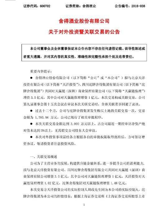 - 2018年6月22日6月20日晚间,舍得酒业(600702)发布公告称,拟斥资1亿元投资天赢链(深圳)商业保理有限公司,共同增资方还有四川沱牌舍得集团有限公司、北京天洋投资有限公司,合计增资额达3.5亿元。《金融投资报》记者注意到,舍得酒业2017年全年净利润为1.44亿元,此次跨界投资将花费其去年近70%的净利润,加之2017年舍得酒业未达营收目标,受到了市场诸多质疑。6月21日,记者就市场普遍关注的问题致电了舍得...