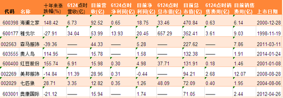 - 2017年10月23日讯\u00A02007年的10月16日,上证指数盘中触及6124点,不少人为之呐喊,高呼万点可期。不知不觉十年过去了,6124仍是遥不可及的高峰。十年之间,A股各行业板块发生了哪些变化?系列文章为您全面解读,(相关阅读:6124点十周年白酒股巨变:五粮液(000858)失色\u00A0古井贡涨幅第一、乳业公司的十年:伊利碾压光明蒙牛\u00A0贝因美(002570)昙花一现),本文选取服装业知名上...
