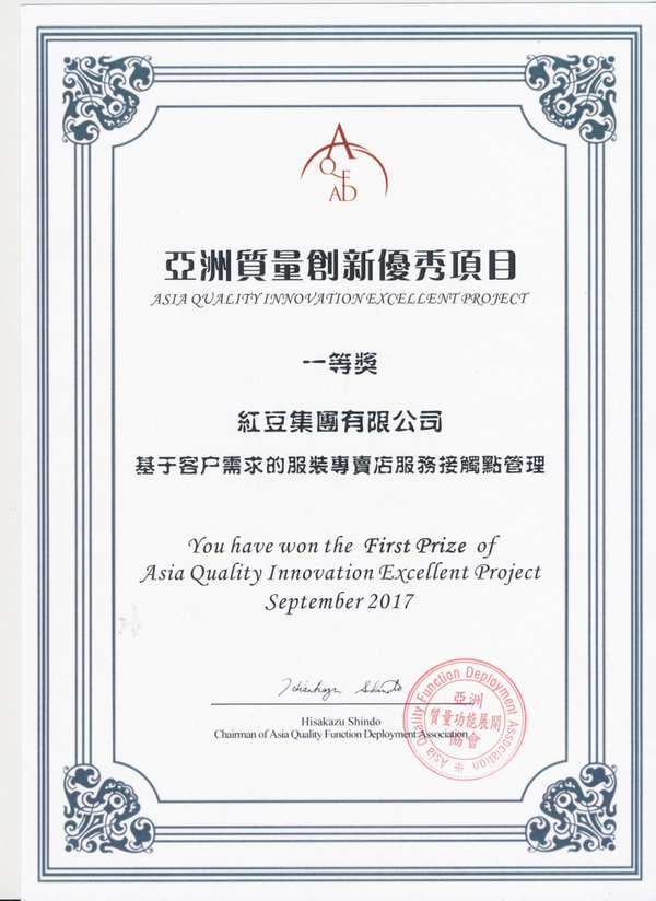 - 2017年10月16日\u00A0\u00A0\u00A0\u00A09月26日-27日,第二届亚洲质量功能展开与创新研讨会在杭州举行,红豆集团发表的“基于客户需求的连锁专卖店服务接触点管理”项目,荣获亚洲质量创新优秀项目一等奖。\u00A0\u00A0\u00A0\u00A0服装产业是红豆集团的主业,面对成本不断上升、人民币升值幅度加大、外部变幻莫测的经营环境,早在2008年,红豆服装板块就提出由生产经营型向创造运营...