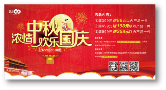 - 2017年9月25日\u00A0\u00A0\u00A0\u00A09月22日至10月8日,红豆男装在线下全国正价门店(商场店、折扣店除外)开展“浓情中秋,欢乐国庆”活动:消费满399元送88元以内产品一件,满699元送168元以内产品一件,满999元送268元以内产品一件;双节嗨不停,线上微博活动同样惊喜:晒出你的出游照片关注并@红豆男装官方微博即有机会获得轻系列产品一件。\u00A0\u00A0\u00A0\u0...