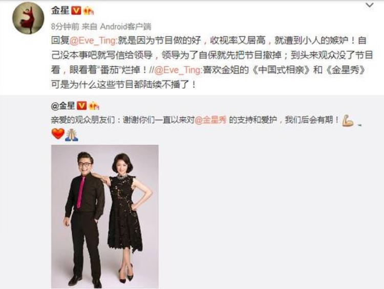 - 2017年9月4日每一个综艺节目或者真人秀都有一定的生命期限,自2015年开播的《金星秀》,金星以自己独特的麻辣点评赢得了满堂彩,而她直爽、不怕得罪人的性格也使得这档节目做得有声有色,“不装”是这个节目的标签,“完美”更是金星的标志。可能会面临永久停播,目前官方还没给出明确消息。你怎么看~8月30日深夜11点01分,金星莫名其妙地更新微博,她写的内容是:亲爱的观众朋友们:谢谢你们一直以来对金星秀的支持和爱护,我们后...