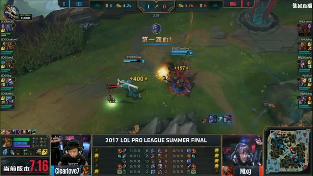 - 2017年9月3日大家期待依旧的LPL夏季赛总决赛终于打响了,RNG迎战EDG战队。尽管两队都已经确定进军S7了,但是对于联赛冠军的诱惑还是很吸引双方,xiaohu表示希望帮助小狗拿到一个冠军,不知道RNG能否夺冠,Uzi打破无冠魔咒呢?在BP上面,RNG的风之BP开始了,摇摆,一起摇摆。最终Uzi祭出久未登场的EZ,难道这是RNG隐藏的杀招?比赛开局,厂长秒打双buff两级直接Gank上路,慎成功拿下一血。9分钟...