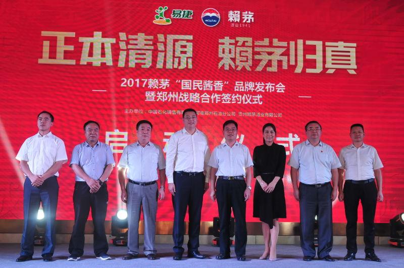 - 2017年8月31日图为发布会上举行的签约仪式.王国轩摄中新网河南新闻8月30日电\u00A08月28日,由贵州赖茅酒业有限公司和中国石化郑州石油分公司联合主办的2017“国民酱香”战略暨赖茅新品上市发布会在郑州召开,贵州茅台酱香酒营销有限公司副总经理郑悄然、副总经理杜建,贵州赖茅酒业有限公司总经理宿梦爝、河南省酒业协会会长熊玉亮,中国石化河南石油分公司领导副总经理李秀山、非油品业务处及零售处等部门负责人、中国石化河...