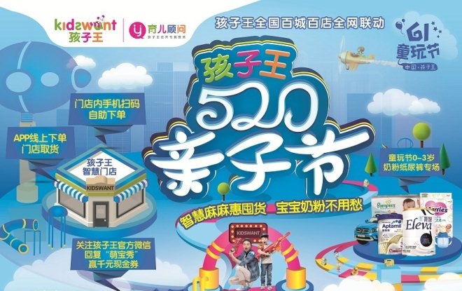 - 2017年8月30日联商网消息:作为“六?一”前最令人期待的全民节日“5?20”,孩子王以爱之名推出“520亲子节”母婴成长新主张,全国百城百店通过全网主题促销及互动活动,呼吁更多关注母亲和孩子共同的成长,让妈妈“惠”囤货,宝宝成长不用愁。孩子王520亲子节期间(5.19-5.22),全国百城百店全网联动,奶粉、纸尿裤、零辅食、营养保健品、安全座椅、玩具全场满额即送通用券,300款母婴用品5折起,17年新款童装低至4...