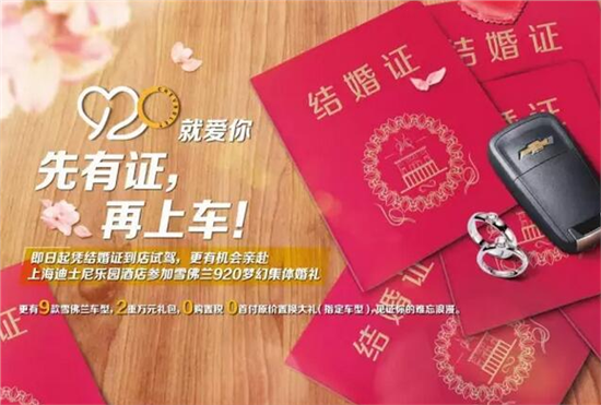 - 2017年8月28日9款车型2重万元礼包0元购车原价置换大礼雪佛兰920享爱特惠季\u00A0给你满满的爱想与心爱的TA在迪士尼举行一场浪漫的梦幻婚礼吗?想在迪士尼城堡下许下一生的承诺,想与TA在车中,来一场说走就走的旅行吗?婚礼与好车,雪佛兰全都带给你!跳动的心相约迪士尼,梦幻婚礼等你来各位有意向购车的新人们注意了!即日起凭结婚证到雪佛兰经销店试驾,即有机会亲赴上海迪士尼乐园酒店参加“雪佛兰920梦幻集体婚礼”,共...