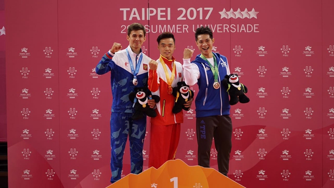 - 2017年8月28日中新社台北8月27日电(记者邢利宇蒋雪林)台北2017世界大学生运动会首次将武术作为比赛项目。来自兰州大学的中国队选手李孟南27日以9.55分的成绩获得男子长拳金牌,中国澳门队选手李祎以9.51的成绩在女子长拳比赛中夺冠。在男子长拳比赛中,中华台北队选手蔡泽民以9.42分成绩获得铜牌,银牌则由俄罗斯选手以9.45分成绩获得。这是武术首次成为世大运比赛项目之一,共有来自世界各地的139位选手参加所有...