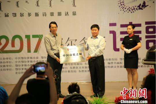 - 2017年8月26日(原标题:鄂尔多斯市被中国作协授予“中国诗歌之城”称号)\u00A0\u00A0\u00A0\u00A0中国作家协会副主席何建明(左)向鄂尔多斯市市长龚明珠颁发“中国诗歌之城”牌匾。主办方供图中新网8月18日电(记者应妮)第二届鄂尔多斯诗歌那达慕启动仪式暨“中国诗歌之城”授牌仪式18日在鄂尔多斯市举行。在启动仪式上,中国作家协会副主席何建明向鄂尔多斯市政府授予了“中国诗歌之城”牌匾。他表示,为繁荣...