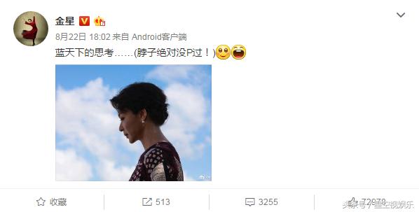 - 2017年8月26日近日金星一直在晒自己在国外陪老公一起休假的照片,因为漏背等照片引起网友热议。就在昨天,刚在休完假的金星又晒出了一张自己照片,照片是金星在蓝天下微微低头,并配文称:“蓝天下的思考…(脖子绝对没P过!)”金星特别强调了一句:脖子绝对没p过!对此就有网友评论金星问道:“为什么在意脖子?”金星回复:“因为舞蹈演员脖子长啊,可有一些人不相信!”看来是怕一些人认为这图是p的,所以就特别加了说明。金星都如此说明...