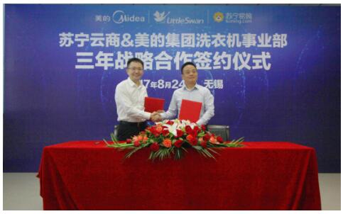 - 2017年8月26日8月24日,苏宁易购总裁侯恩龙、苏宁易购电器公司总裁助理吴丁剑、苏宁易购冰洗公司总裁徐仲等一行来到无锡,与美的集团洗衣机事业部总经理陆剑峰、美的集团洗衣机事业部国内市场总经理骆泽源、美的集团洗衣机事业部研发中心主任徐彭城等,就苏宁与美的系洗衣机的未来合作规划达成共识,双方敲定未来三年苏宁与美的洗衣机事业部180亿元的销售目标。战略合作聚焦高端产品2015年7月,苏宁与美的洗衣机事业部共同制定了“未...